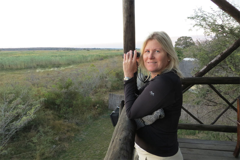 Laurie with Arno's wife Estelle at their private waterhole that attracts elephants nightly.