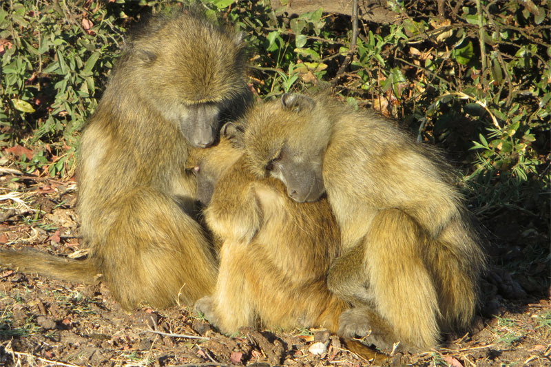 Chacma baboons huddling at sunrise to keep warm.