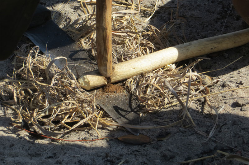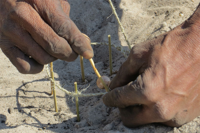 Setting the trap by connecting the twine to a tasty nut stuck in the ground.