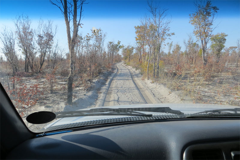 Driving along a sandy road the next morning. Here we were hundreds of kilometers from the nearest paved road.