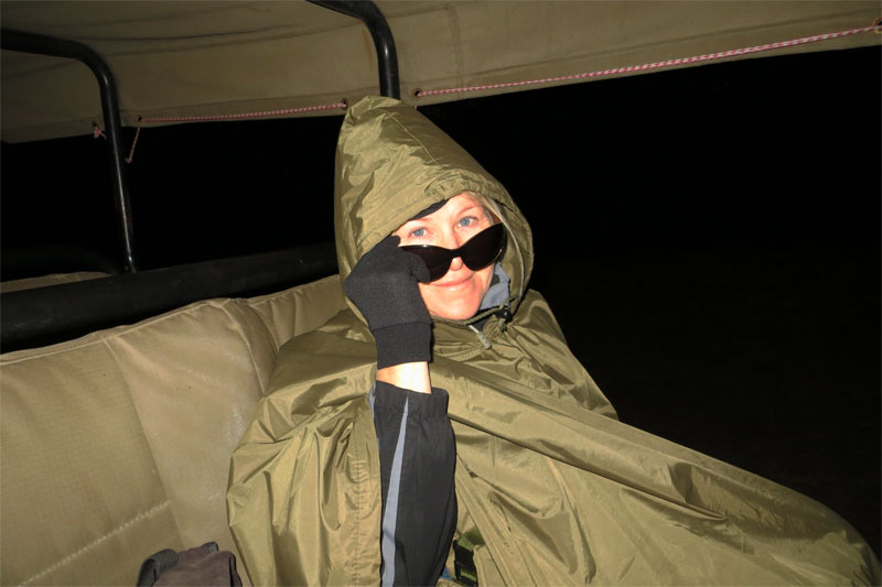 Early morning game drive with insulated ponchos. "It won't be cold in Africa" said Tony. Oops - fortunately they