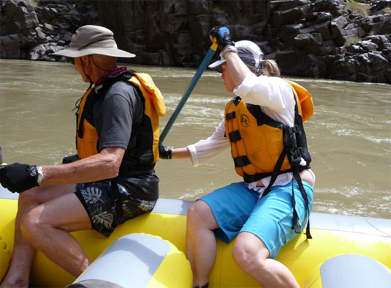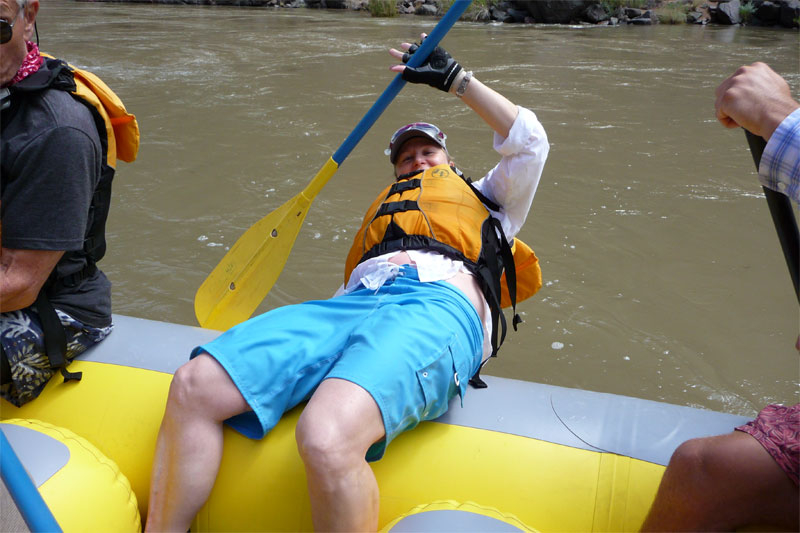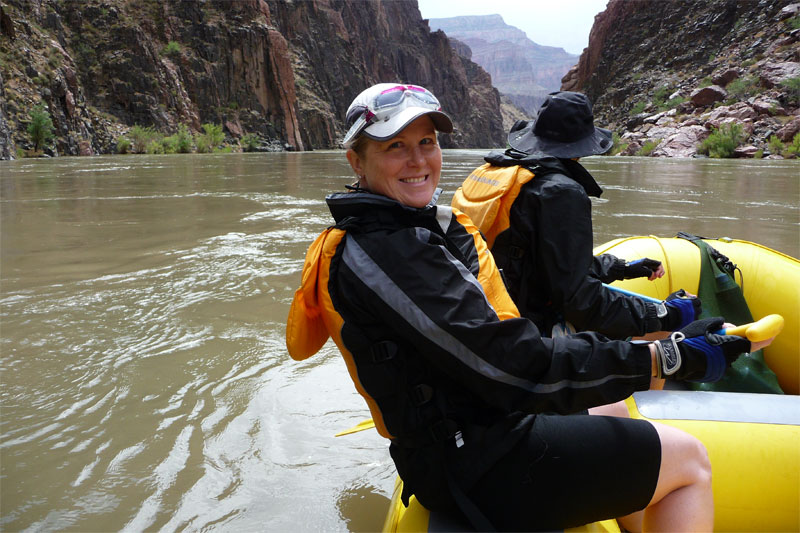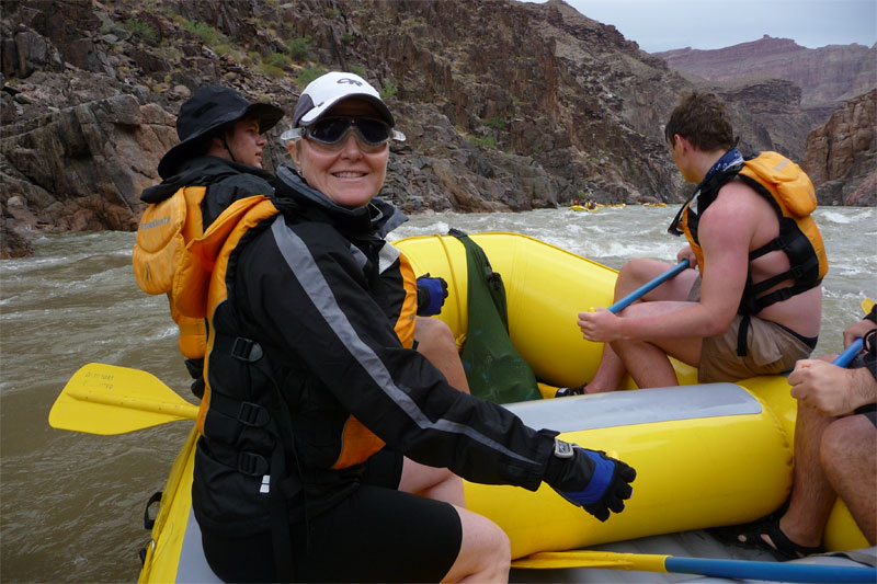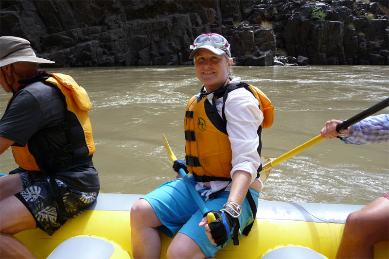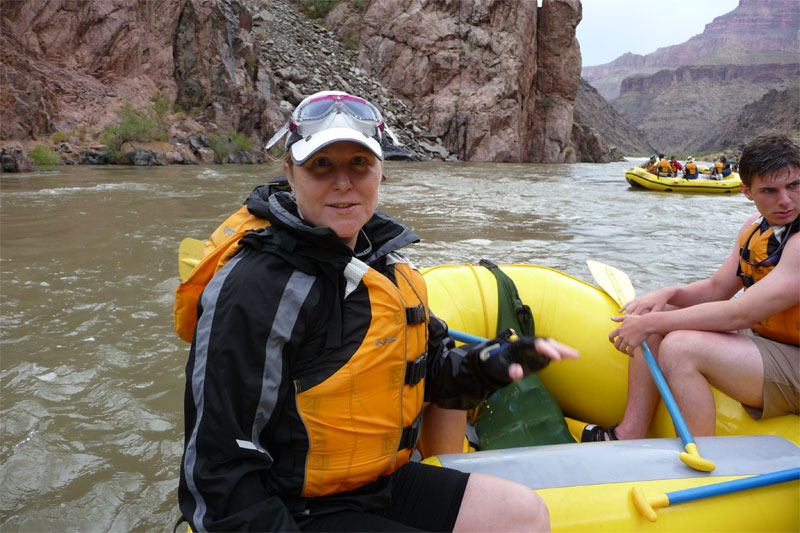 Laurie dons goggles for the larger rapids so if she falls out, her contacts will stay intact.
