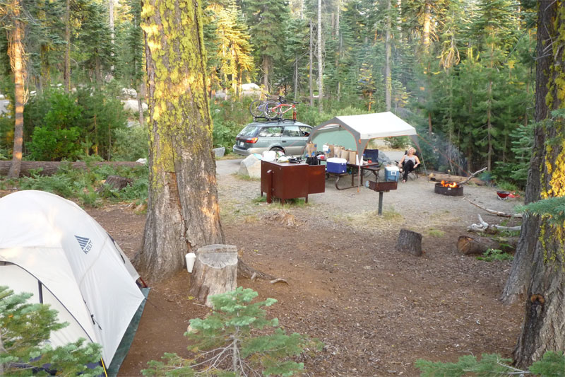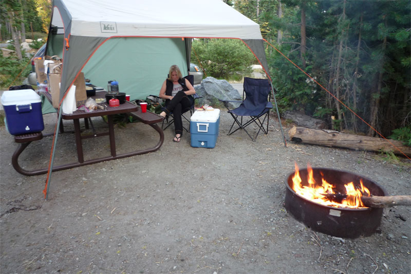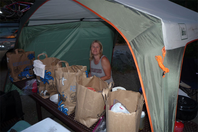Basecamp. In the tent at left are an air mattress, mattress pad, and flannel sheets!